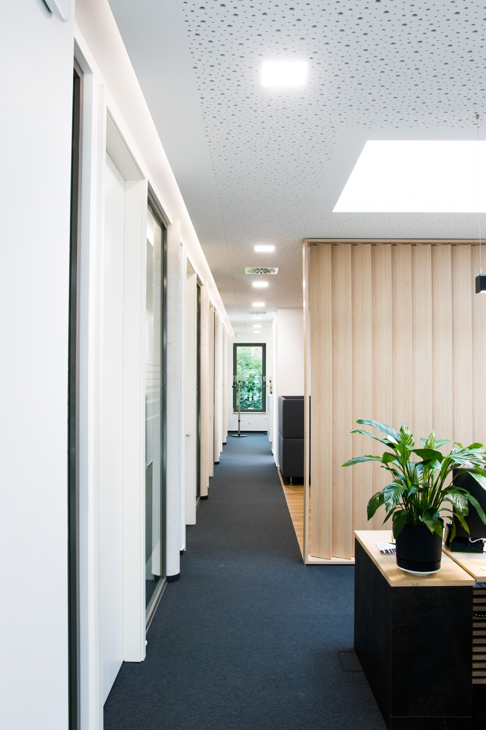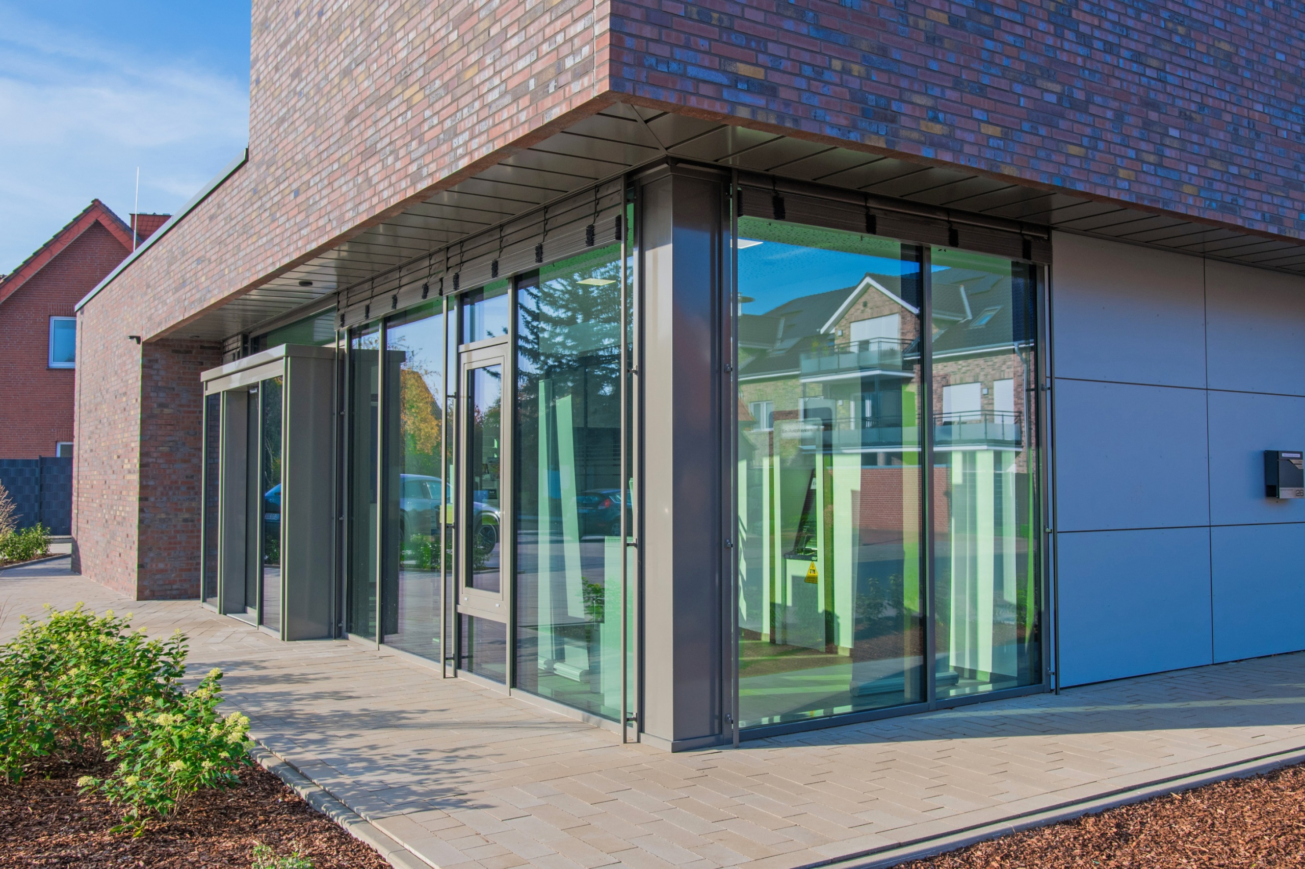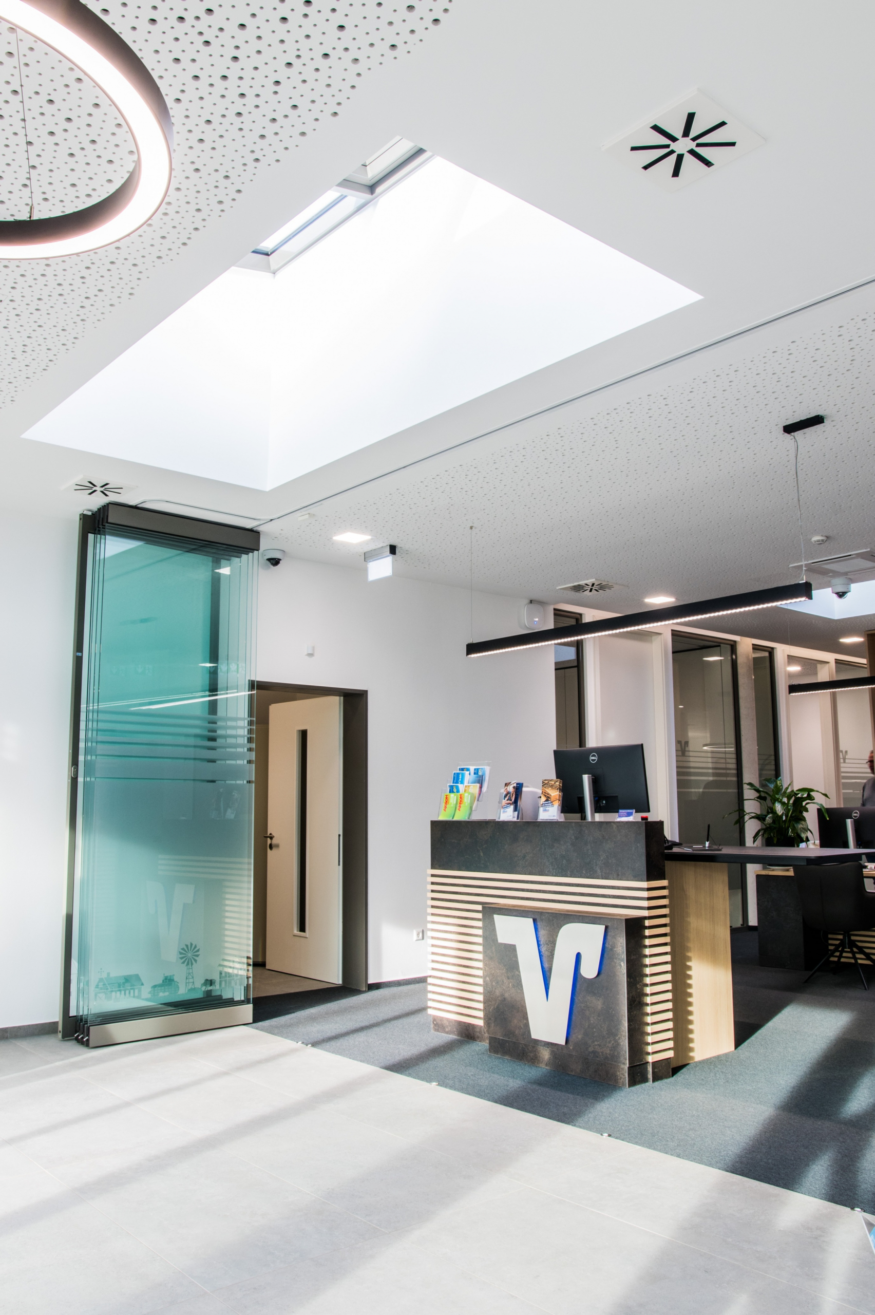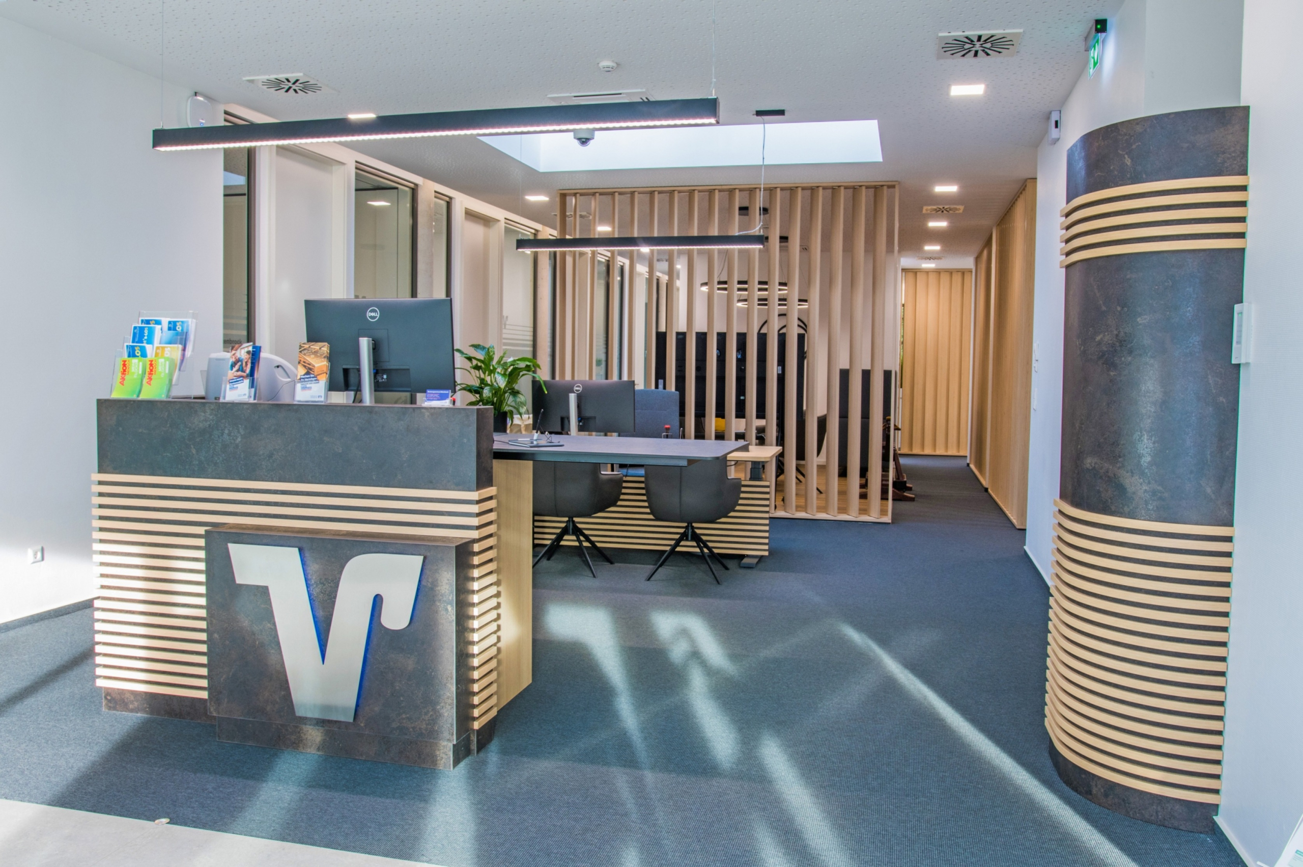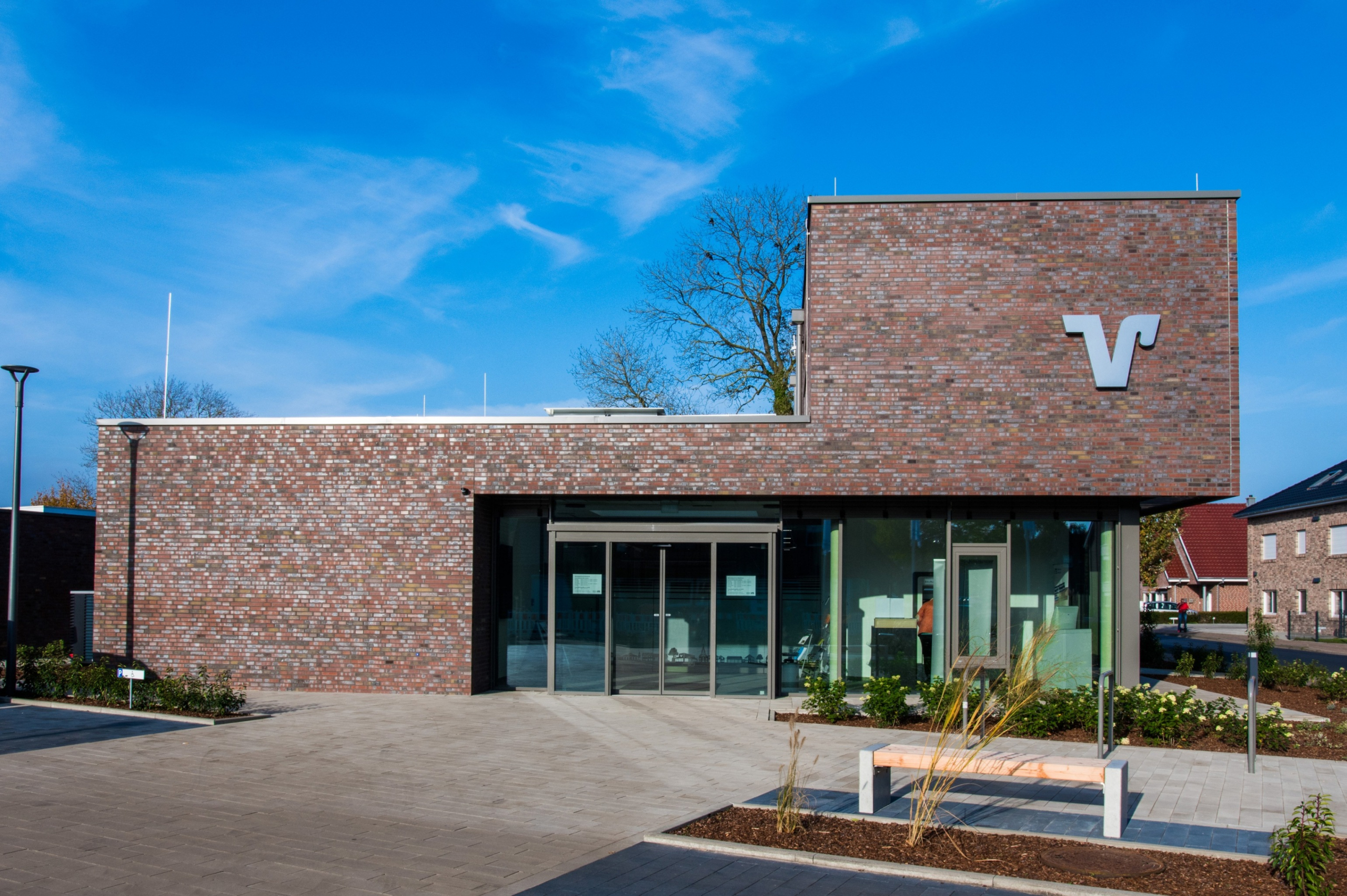 Die Digitalisierung und der Wandel in der Bankenlandschaft haben die Anforderungen an Bankgebäude grundlegend verändert. Klassische Schalterfunktionen treten zunehmend in den Hintergrund, während persönliche Beratung und flexible Arbeitsformen an Bedeutung gewinnen. Das bestehende Bankgebäude war diesen Anforderungen nicht mehr gewachsen. Der Neubau wurde daher in drei klar strukturierte Zonen gegliedert: Ein moderner Arbeitsbereich mit höhenverstellbaren Schreibtischen und flexibler Arbeitsplatzbuchung ermöglicht dank papierloser Prozesse eine zeitgemäße Nutzung. Eine zentrale Mittelzone mit Wartebereich, Kopier- und Druckstationen sowie einem Serviceschalter für kurze Beratungen bildet das kommunikative Herz des Gebäudes. Drei Lichtsheddächer sorgen hier für eine gezielte natürliche Belichtung. Der dritte Bereich umfasst fünf separate Beratungszimmer, in denen Kundengespräche in ruhiger und diskreter Atmosphäre stattfinden. Beratung erfolgt damit nicht mehr am Arbeitsplatz der Mitarbeitenden, sondern in dafür vorgesehenen Räumlichkeiten. Zur Straßenseite entstand aus städtebaulichen Gründen ein zweigeschossiger Baukörper mit dem Mitarbeiterbereich und einer Dachterrasse. Der Neubau vereint funktionale Klarheit, moderne Architektur und flexible Nutzung zu einem zukunftsfähigen Bankgebäude für Kunden und Mitarbeitende.