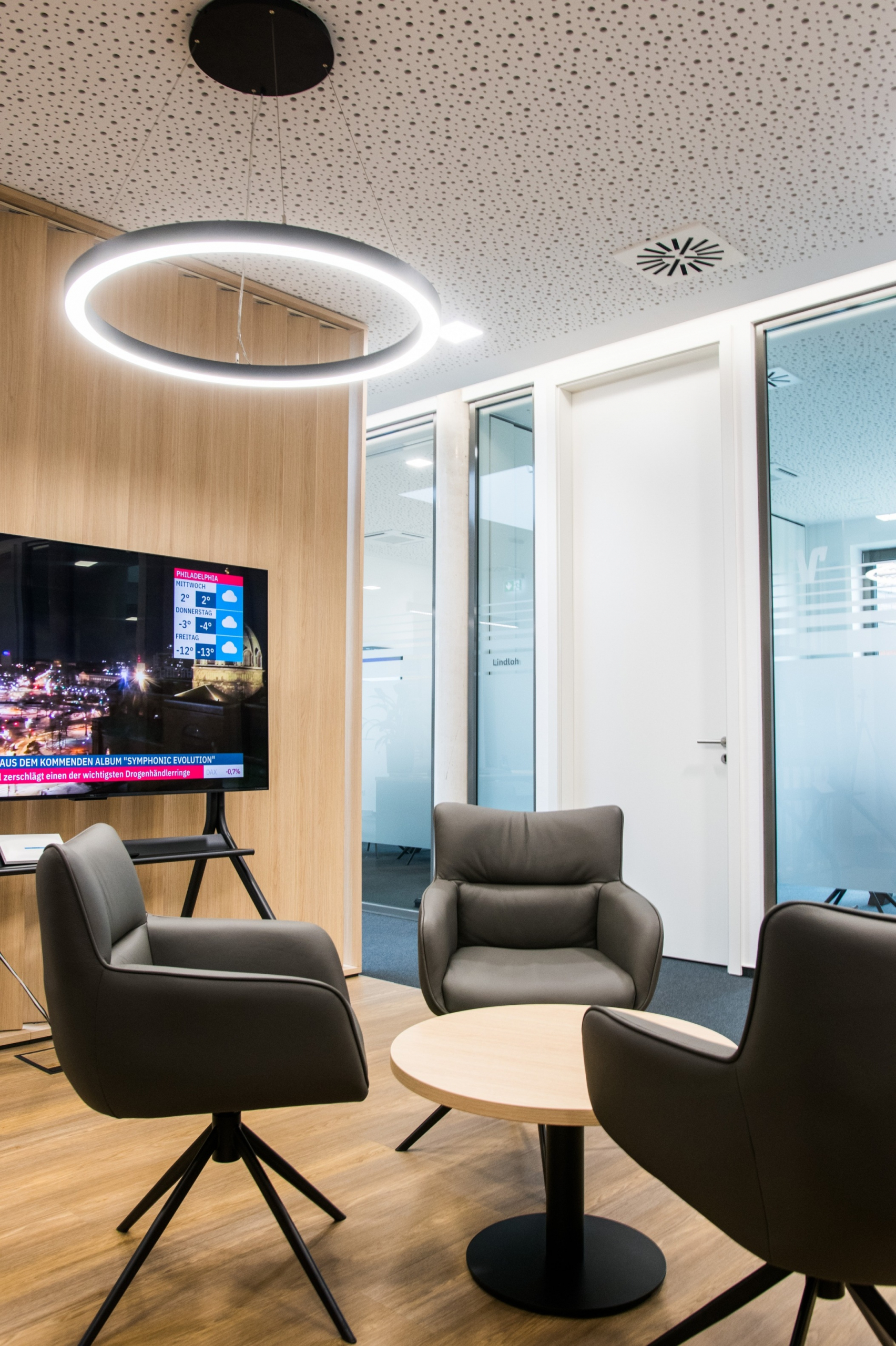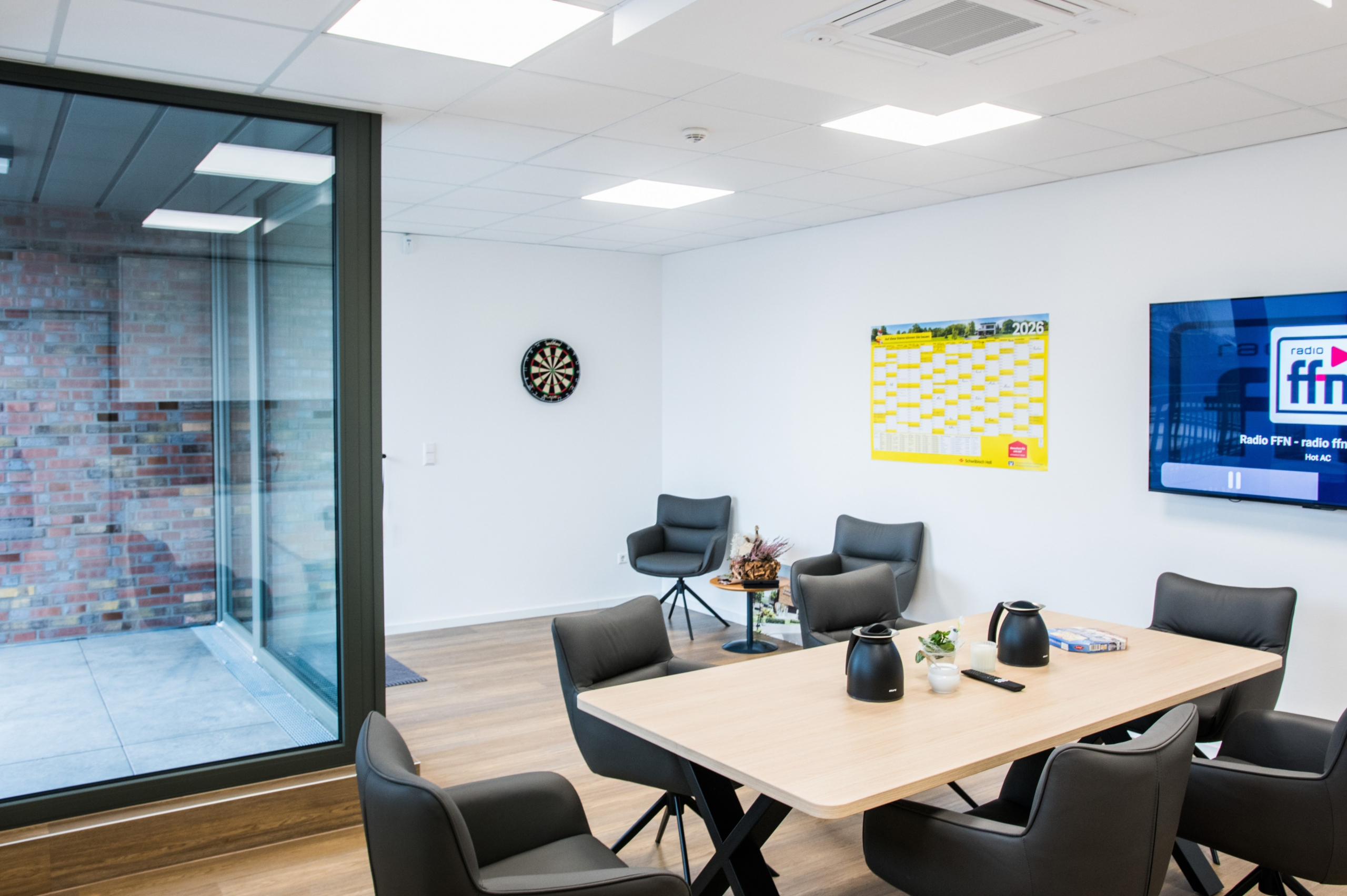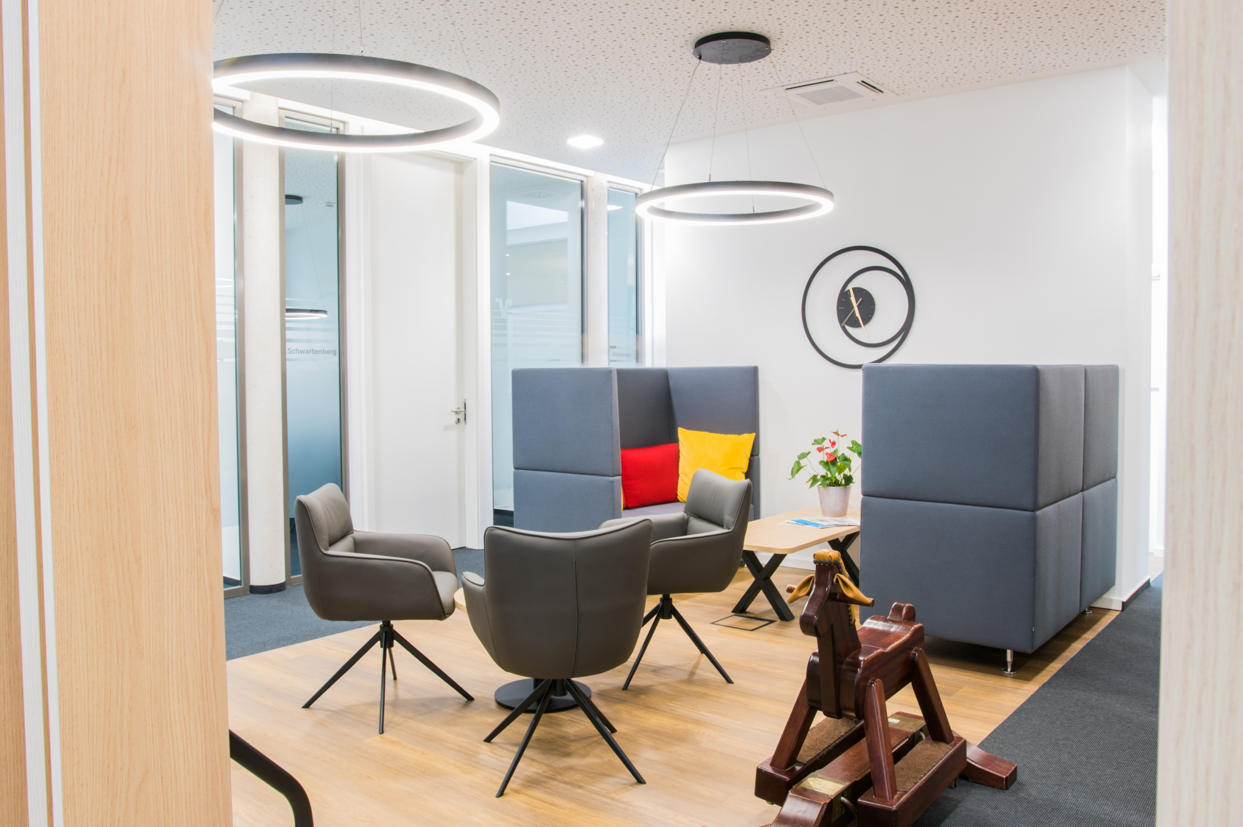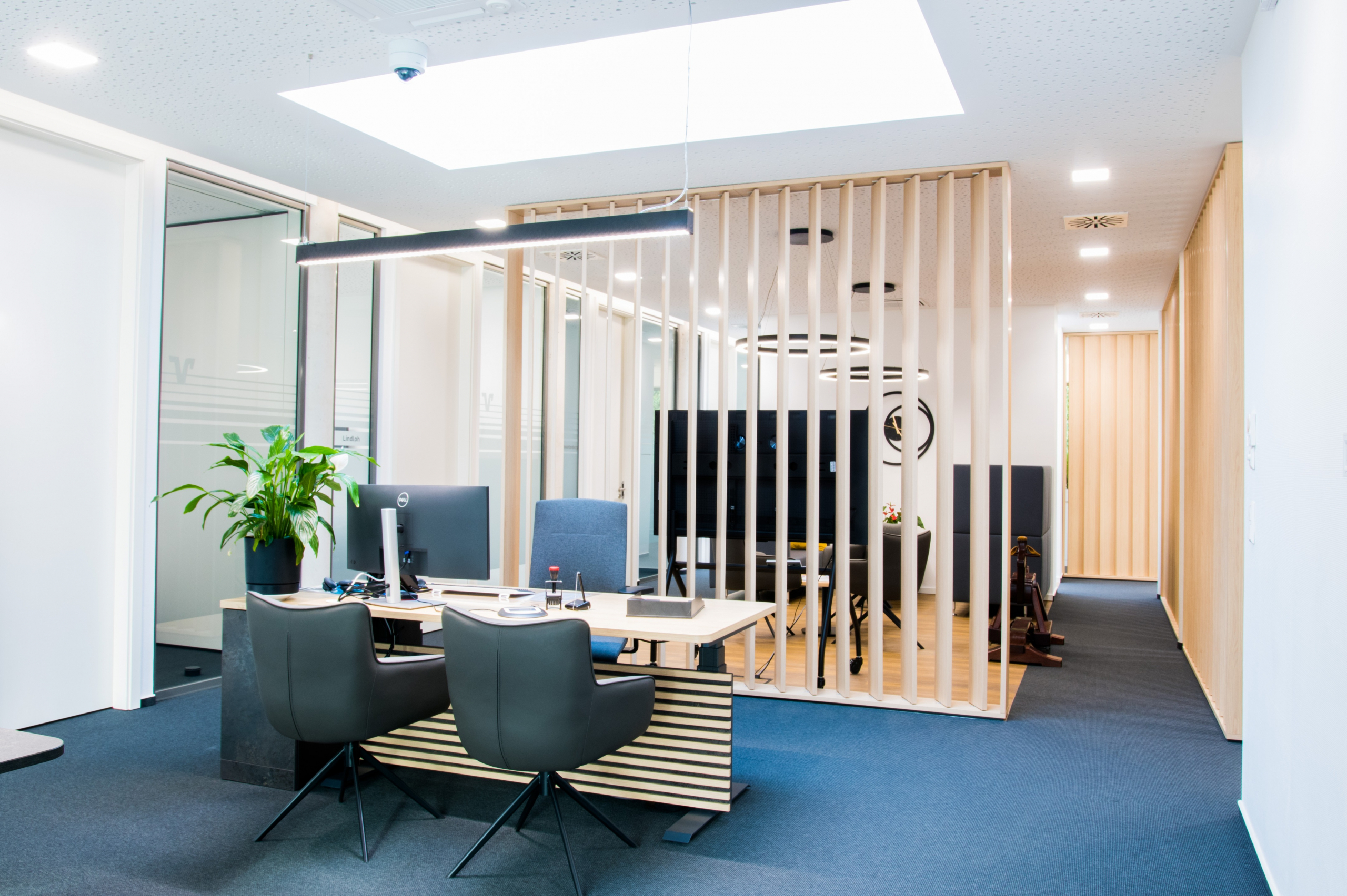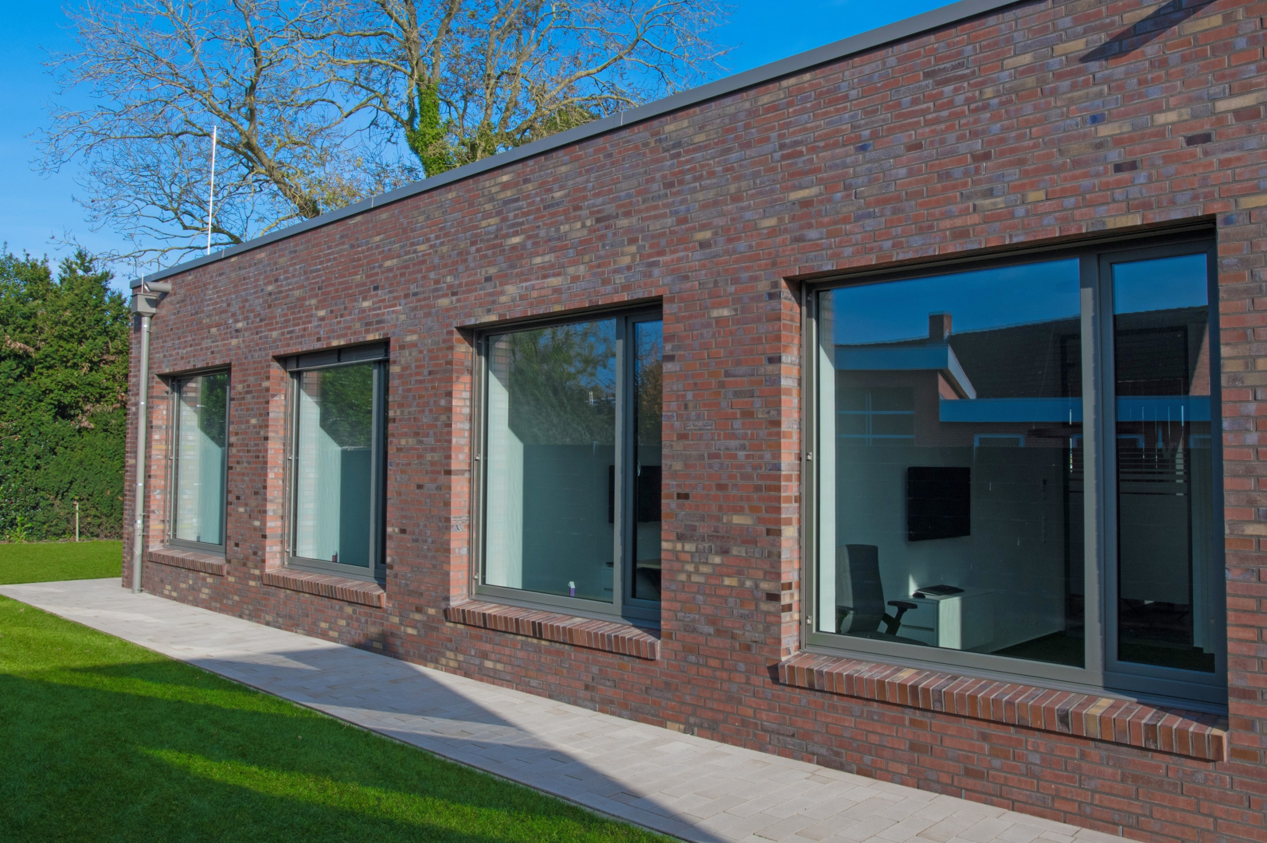 Die Digitalisierung und der Wandel in der Bankenlandschaft haben die Anforderungen an Bankgebäude grundlegend verändert. Klassische Schalterfunktionen treten zunehmend in den Hintergrund, während persönliche Beratung und flexible Arbeitsformen an Bedeutung gewinnen. Das bestehende Bankgebäude war diesen Anforderungen nicht mehr gewachsen. Der Neubau wurde daher in drei klar strukturierte Zonen gegliedert: Ein moderner Arbeitsbereich mit höhenverstellbaren Schreibtischen und flexibler Arbeitsplatzbuchung ermöglicht dank papierloser Prozesse eine zeitgemäße Nutzung. Eine zentrale Mittelzone mit Wartebereich, Kopier- und Druckstationen sowie einem Serviceschalter für kurze Beratungen bildet das kommunikative Herz des Gebäudes. Drei Lichtsheddächer sorgen hier für eine gezielte natürliche Belichtung. Der dritte Bereich umfasst fünf separate Beratungszimmer, in denen Kundengespräche in ruhiger und diskreter Atmosphäre stattfinden. Beratung erfolgt damit nicht mehr am Arbeitsplatz der Mitarbeitenden, sondern in dafür vorgesehenen Räumlichkeiten. Zur Straßenseite entstand aus städtebaulichen Gründen ein zweigeschossiger Baukörper mit dem Mitarbeiterbereich und einer Dachterrasse. Der Neubau vereint funktionale Klarheit, moderne Architektur und flexible Nutzung zu einem zukunftsfähigen Bankgebäude für Kunden und Mitarbeitende.