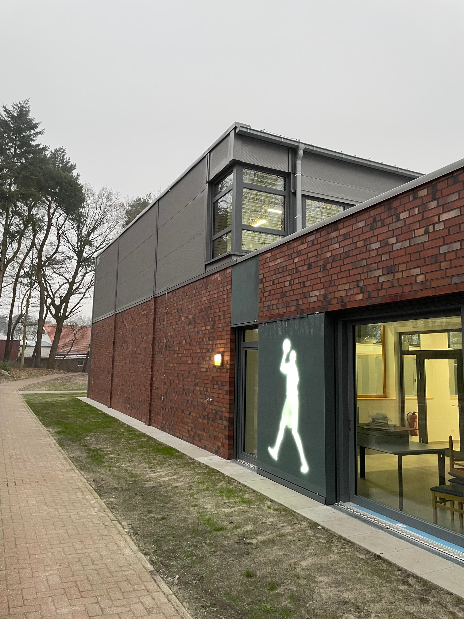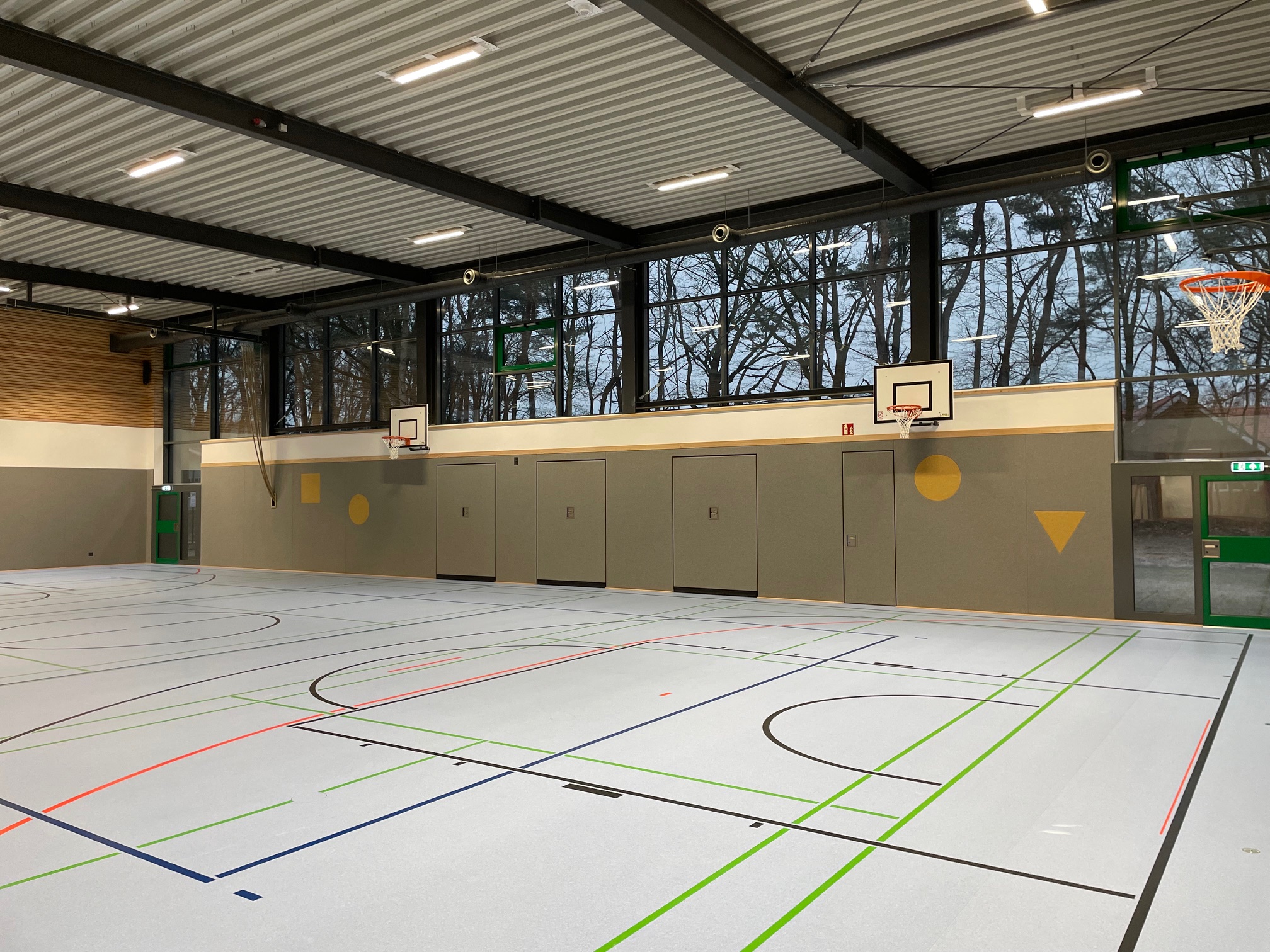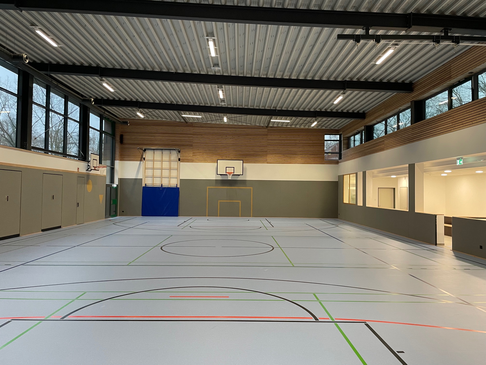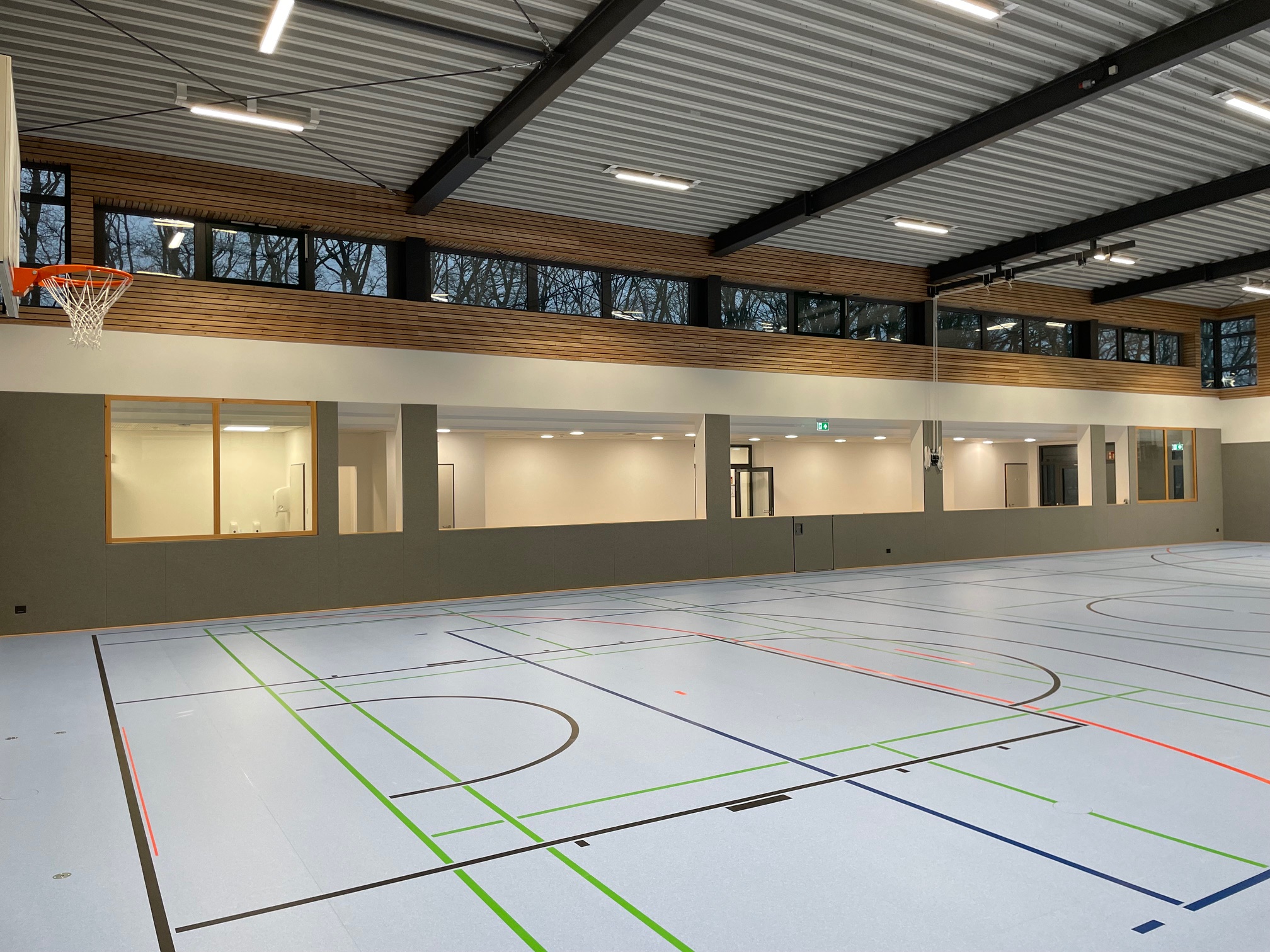 Die Einfeldsporthalle wurde als eingeschossiger, klar strukturierter Baukörper mit giebelständigem Pultdach entlang der Schützenstraße realisiert. Eine großzügige Glasfassade öffnet das Gebäude vollständig nach Nordwesten und sorgt dank einer zusätzlichen Sonnenschutzverglasung für blendfreies Tageslicht und effektiven sommerlichen Wärmeschutz. Die bis in die Gebäudeecken geführte Verglasung ermöglicht vielfältige Sichtverbindungen zwischen Innen- und Außenraum. Eine vorgelagerte, symmetrische Zuschauerzone mit bis zu 50 Sitzplätzen auf etwa 20 Metern Breite bietet optimale Einblicke in die Sporthalle. Am Ende dieser Zone schafft ein hochwertig gestalteter Aufenthaltsbereich mit südwestlicher Ausrichtung helle, freundliche Räume und zugleich eine direkte Sichtverbindung in das Hallengeschehen.