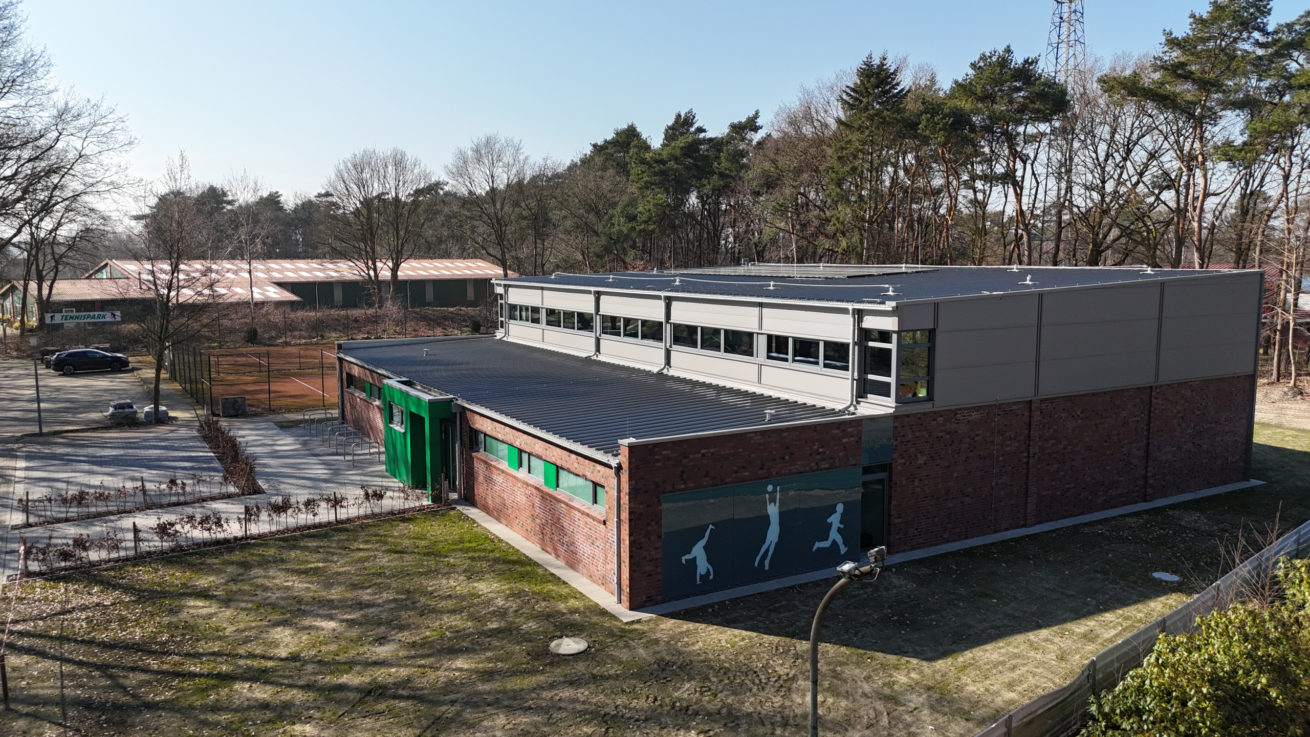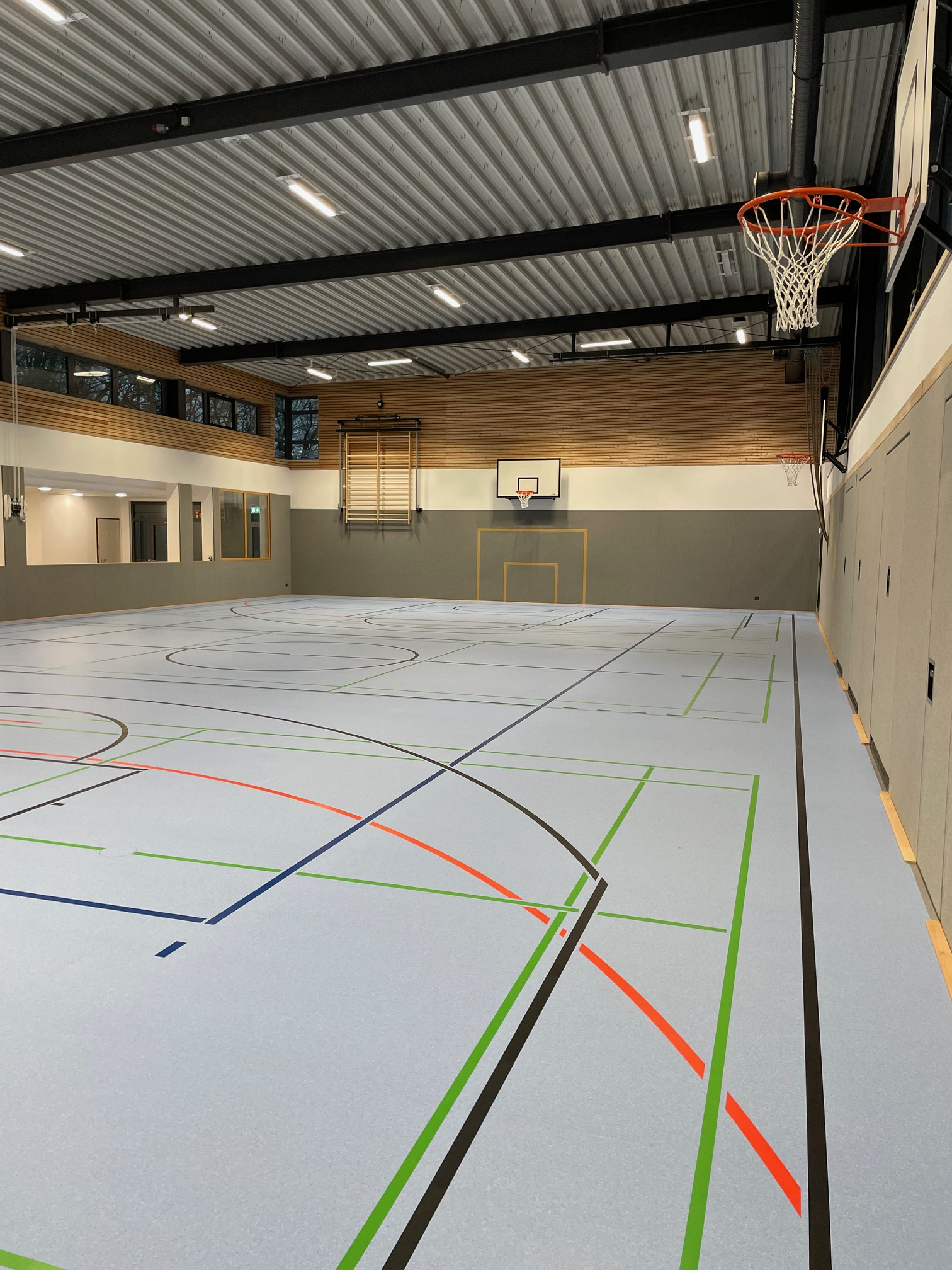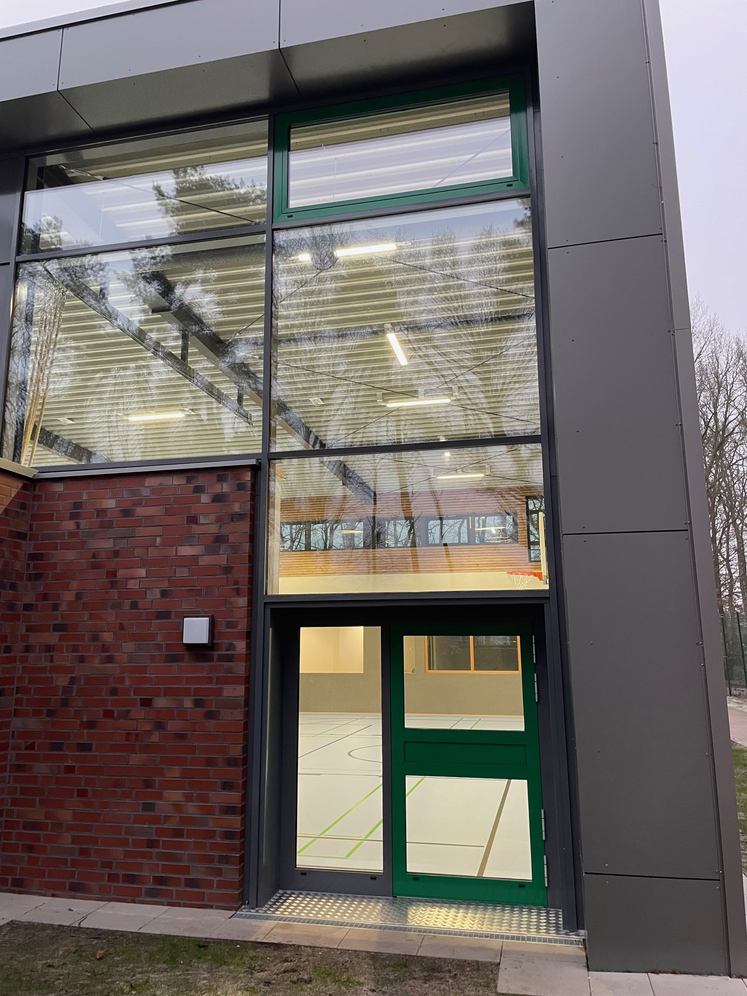 Die Einfeldsporthalle wurde als eingeschossiger, klar strukturierter Baukörper mit giebelständigem Pultdach entlang der Schützenstraße realisiert. Eine großzügige Glasfassade öffnet das Gebäude vollständig nach Nordwesten und sorgt dank einer zusätzlichen Sonnenschutzverglasung für blendfreies Tageslicht und effektiven sommerlichen Wärmeschutz. Die bis in die Gebäudeecken geführte Verglasung ermöglicht vielfältige Sichtverbindungen zwischen Innen- und Außenraum. Eine vorgelagerte, symmetrische Zuschauerzone mit bis zu 50 Sitzplätzen auf etwa 20 Metern Breite bietet optimale Einblicke in die Sporthalle. Am Ende dieser Zone schafft ein hochwertig gestalteter Aufenthaltsbereich mit südwestlicher Ausrichtung helle, freundliche Räume und zugleich eine direkte Sichtverbindung in das Hallengeschehen.