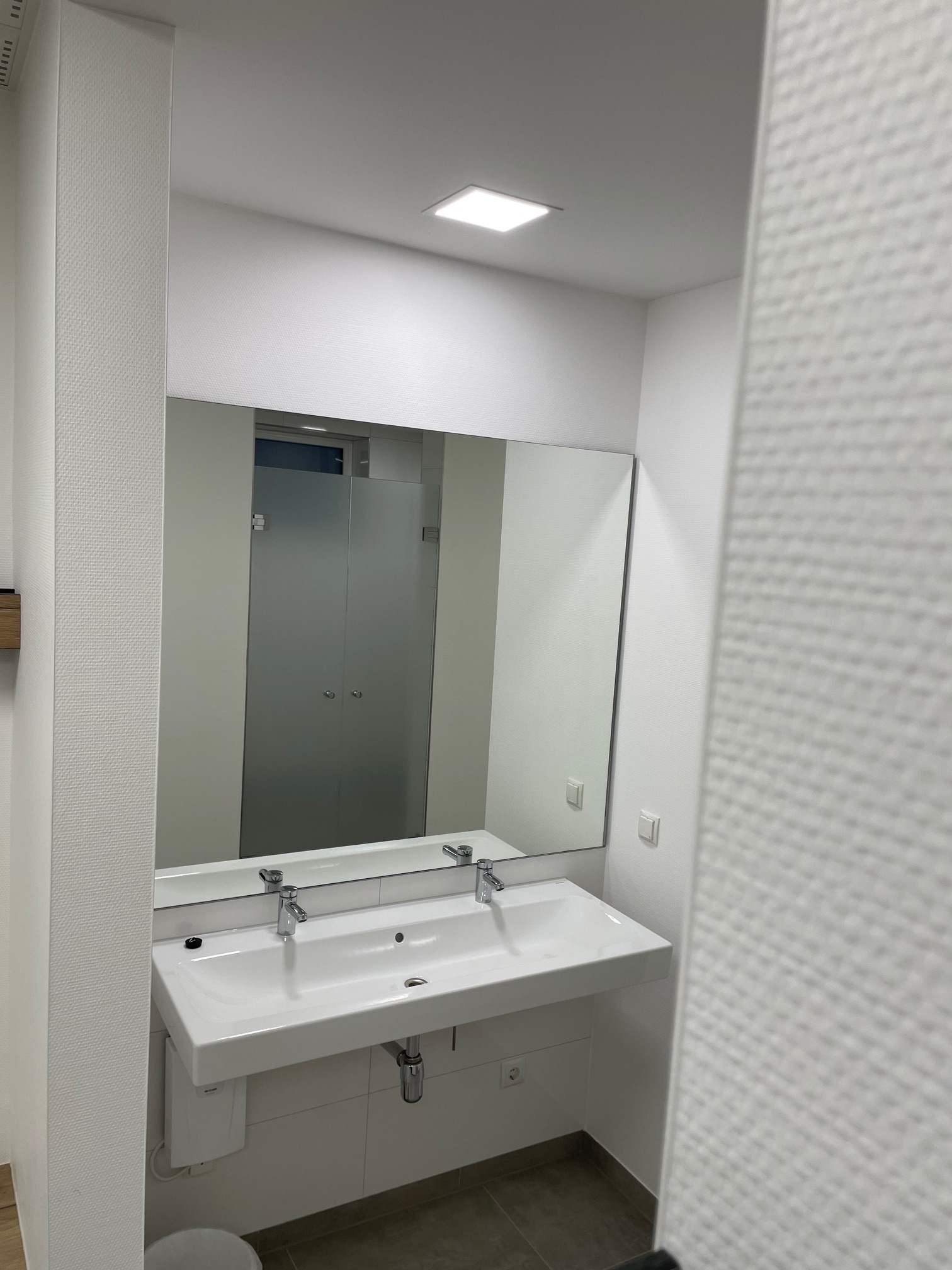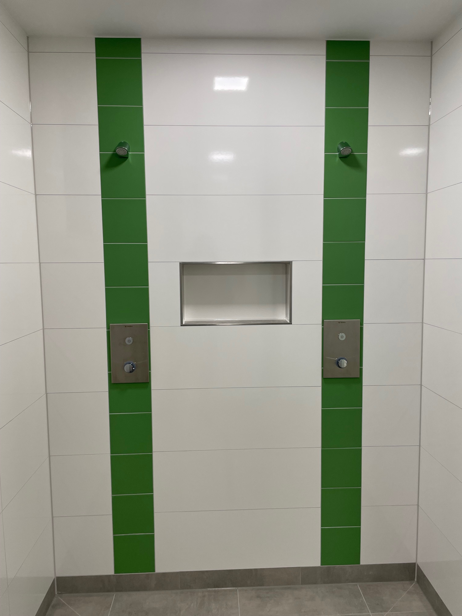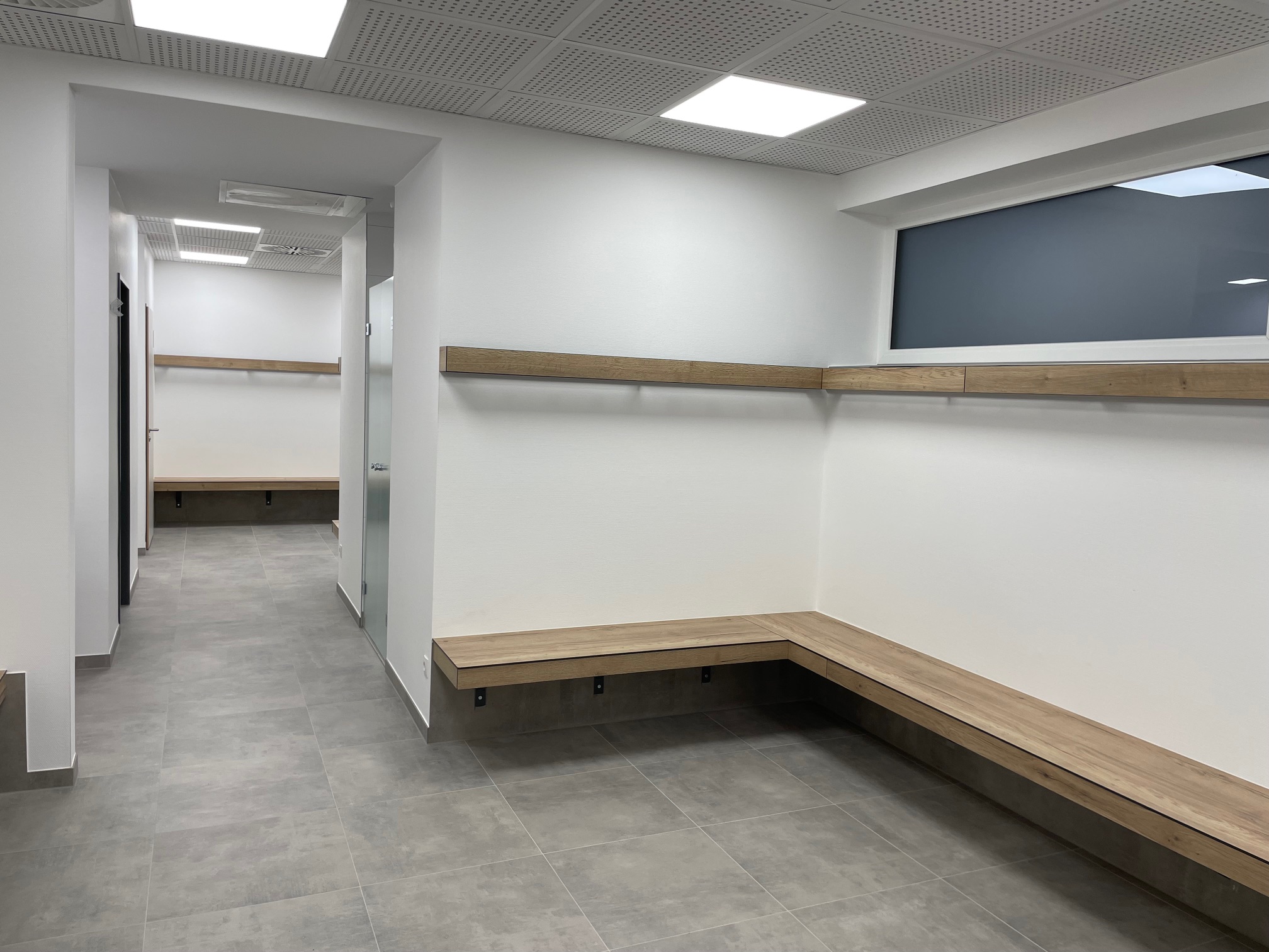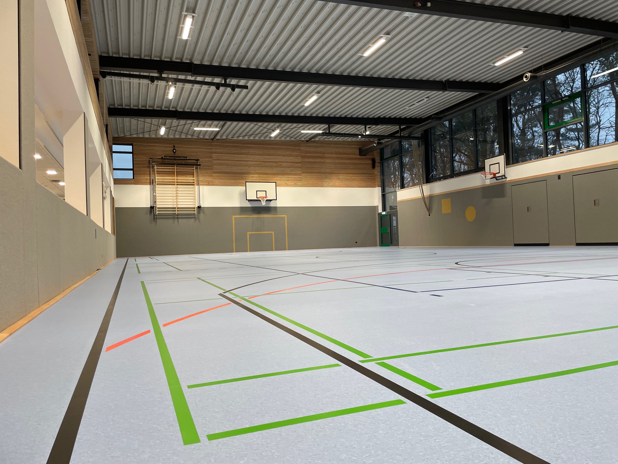 Die Einfeldsporthalle wurde als eingeschossiger, klar strukturierter Baukörper mit giebelständigem Pultdach entlang der Schützenstraße realisiert. Eine großzügige Glasfassade öffnet das Gebäude vollständig nach Nordwesten und sorgt dank einer zusätzlichen Sonnenschutzverglasung für blendfreies Tageslicht und effektiven sommerlichen Wärmeschutz. Die bis in die Gebäudeecken geführte Verglasung ermöglicht vielfältige Sichtverbindungen zwischen Innen- und Außenraum. Eine vorgelagerte, symmetrische Zuschauerzone mit bis zu 50 Sitzplätzen auf etwa 20 Metern Breite bietet optimale Einblicke in die Sporthalle. Am Ende dieser Zone schafft ein hochwertig gestalteter Aufenthaltsbereich mit südwestlicher Ausrichtung helle, freundliche Räume und zugleich eine direkte Sichtverbindung in das Hallengeschehen.