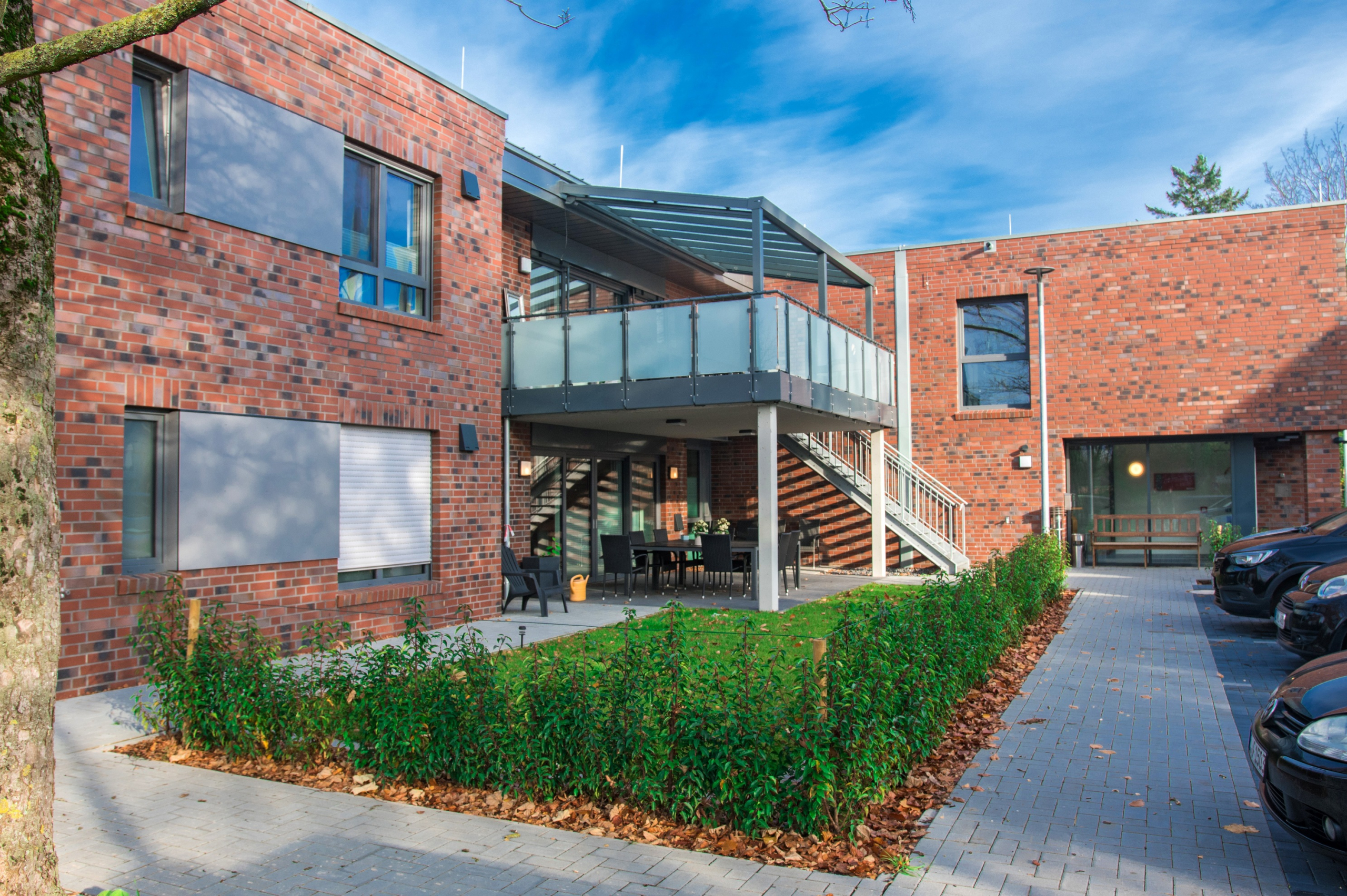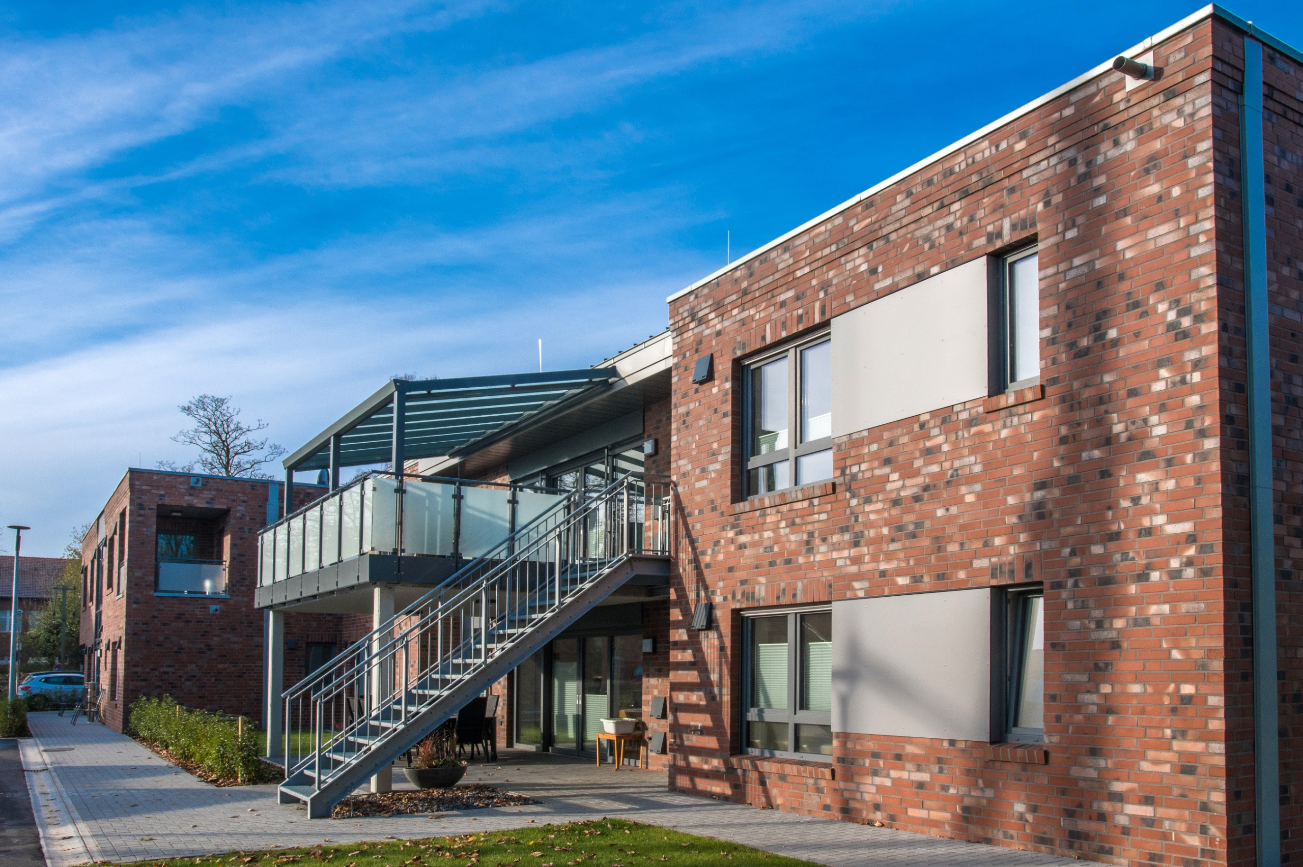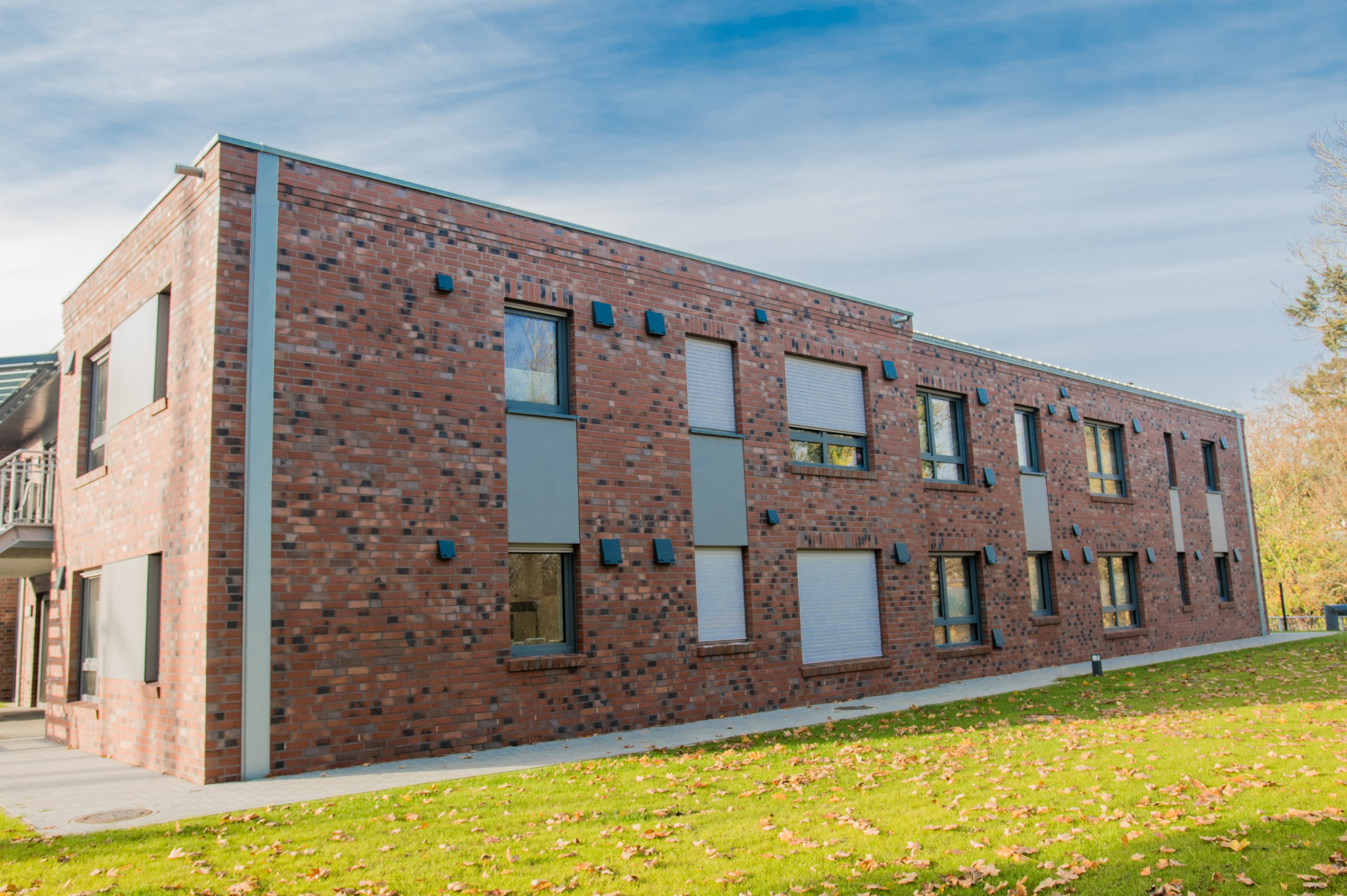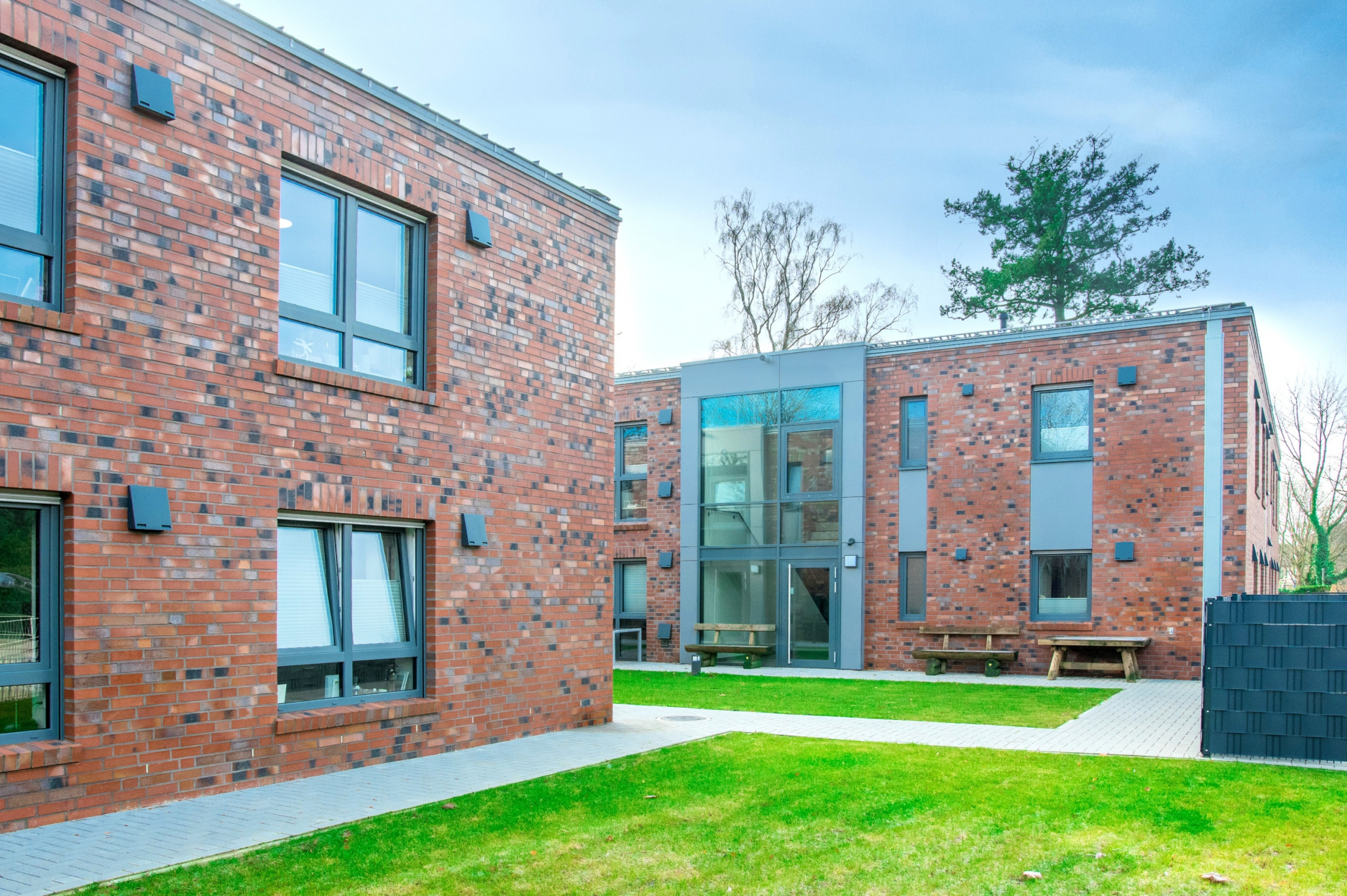 Auf dem Grundstück eines alten Wohnheims entstand eine moderne Wohnanlage, die Menschen mit Einschränkungen ein selbstbestimmtes, würdevolles und gemeinschaftliches Leben ermöglicht. Das neue Gebäude ersetzt die veralteten Einzel- und Doppelzimmer sowie Gemeinschaftsbäder und erfüllt nun höchste Anforderungen an Barrierefreiheit und Teilhabe. Das Konzept umfasst zwei Gebäudewürfel mit jeweils einem hellen Lichthof. Jeder Würfel beherbergt eine Wohngemeinschaft im Erdgeschoss und eine im Obergeschoss. Jede Wohngemeinschaft verfügt über zehn Einzelzimmer mit eigenem barrierefreiem Bad sowie einen großzügigen Wohn- und Essbereich. Hauswirtschaftsraum, Sterilraum, Vorratsraum und ein Büro für Gruppenleitung und Mitarbeitende ergänzen das Angebot. Ein verbindender Baukörper mit Treppenhaus und Aufzug sorgt für barrierefreie Erschließung. Im Erdgeschoss ist ein Bereich für die Nachtwache mit eigenem Bad untergebracht. Hier befinden sich außerdem Lagerflächen, Abstellräume, ein Personalaufenthaltsraum mit WC sowie ein Pflegebad für alle Wohngruppen. Die Anlage ist funktional, wohnlich und flexibel nutzbar. Sie bietet Sicherheit, Orientierung und Gemeinschaft, zugleich Freiraum für selbstbestimmtes Leben. Durch die klare Struktur und flexible Raumgestaltung ist perspektivisch auch eine alternative Nutzung, z. B. als Seniorentagesstätte, möglich.