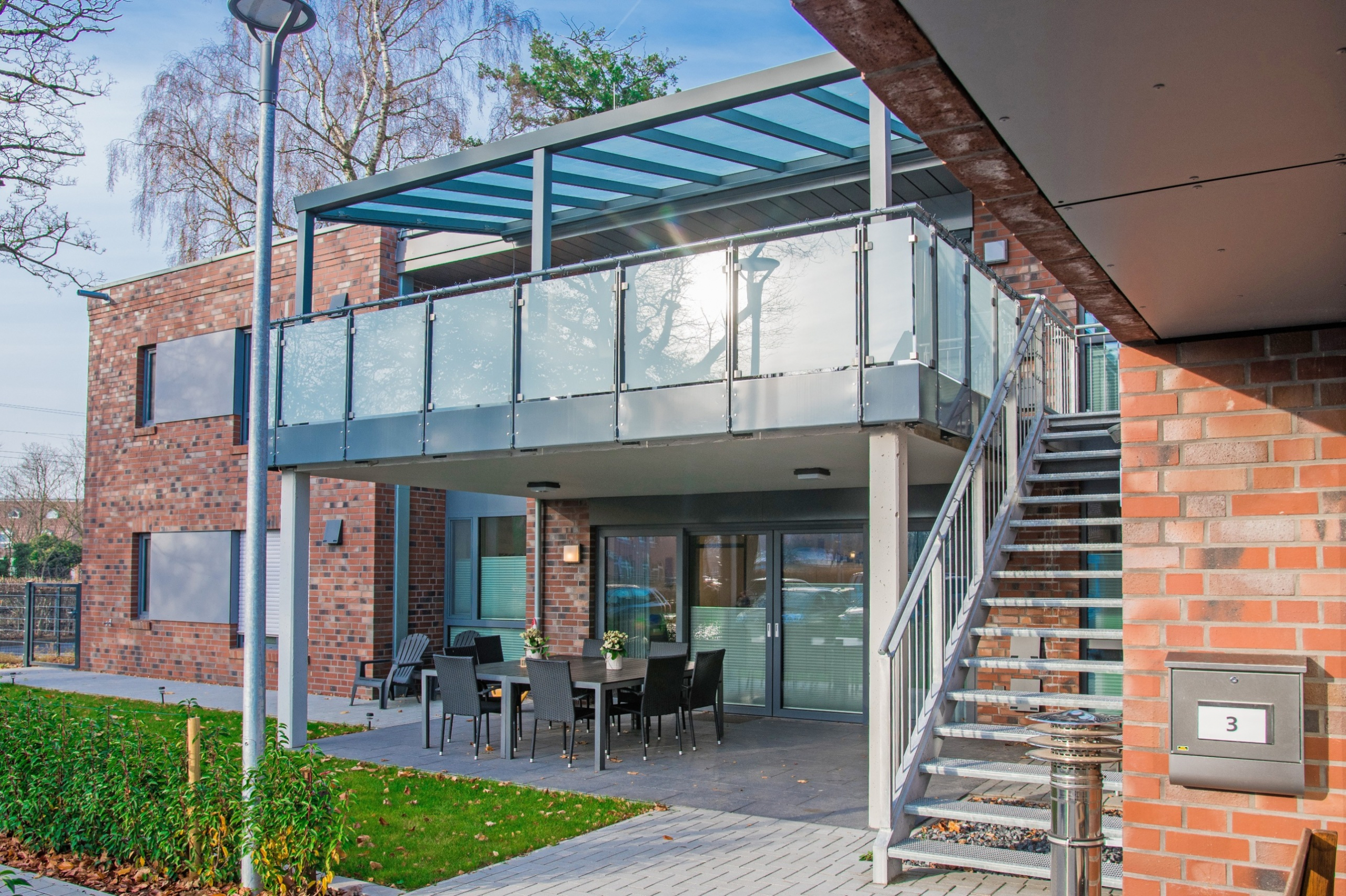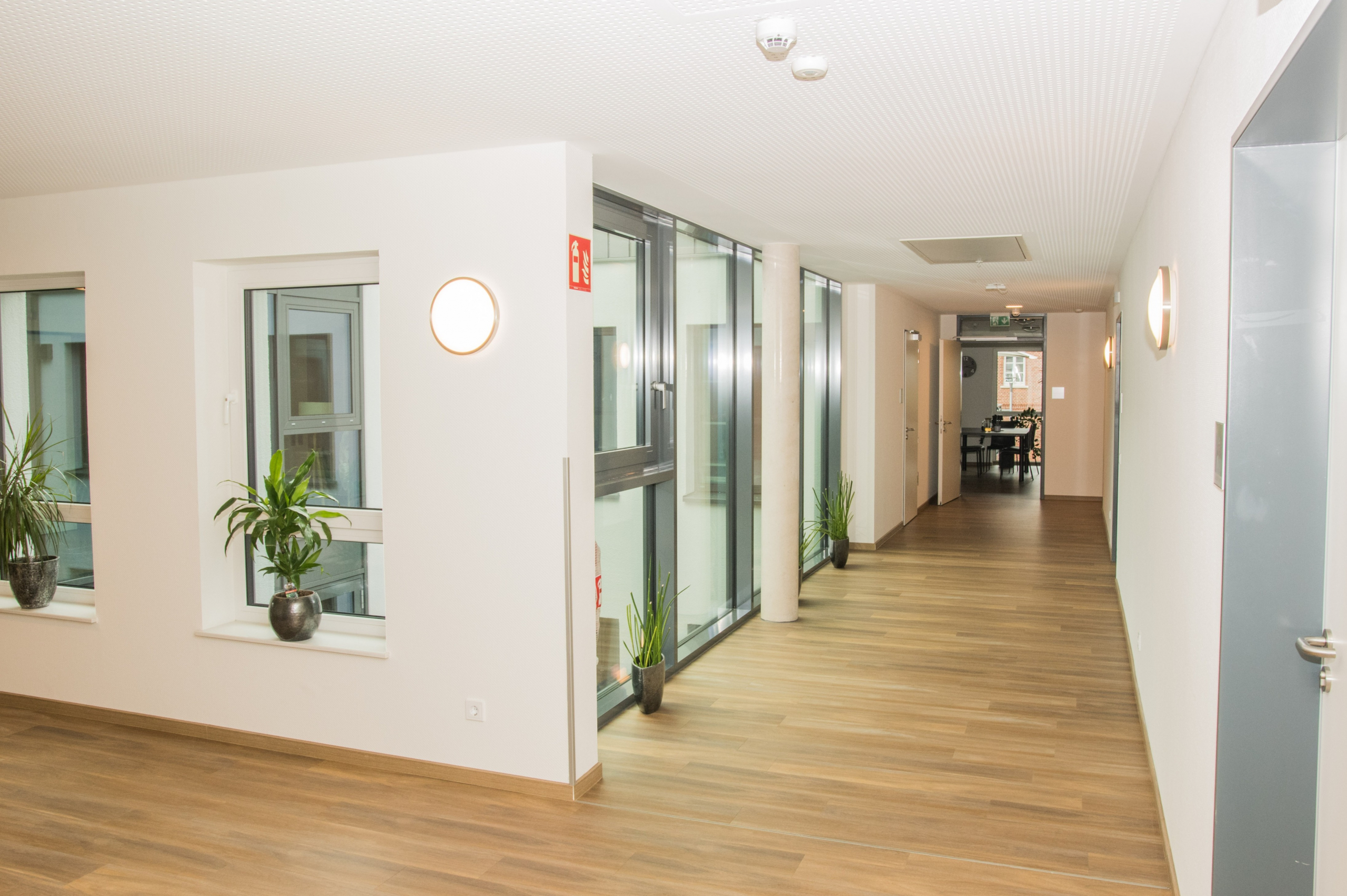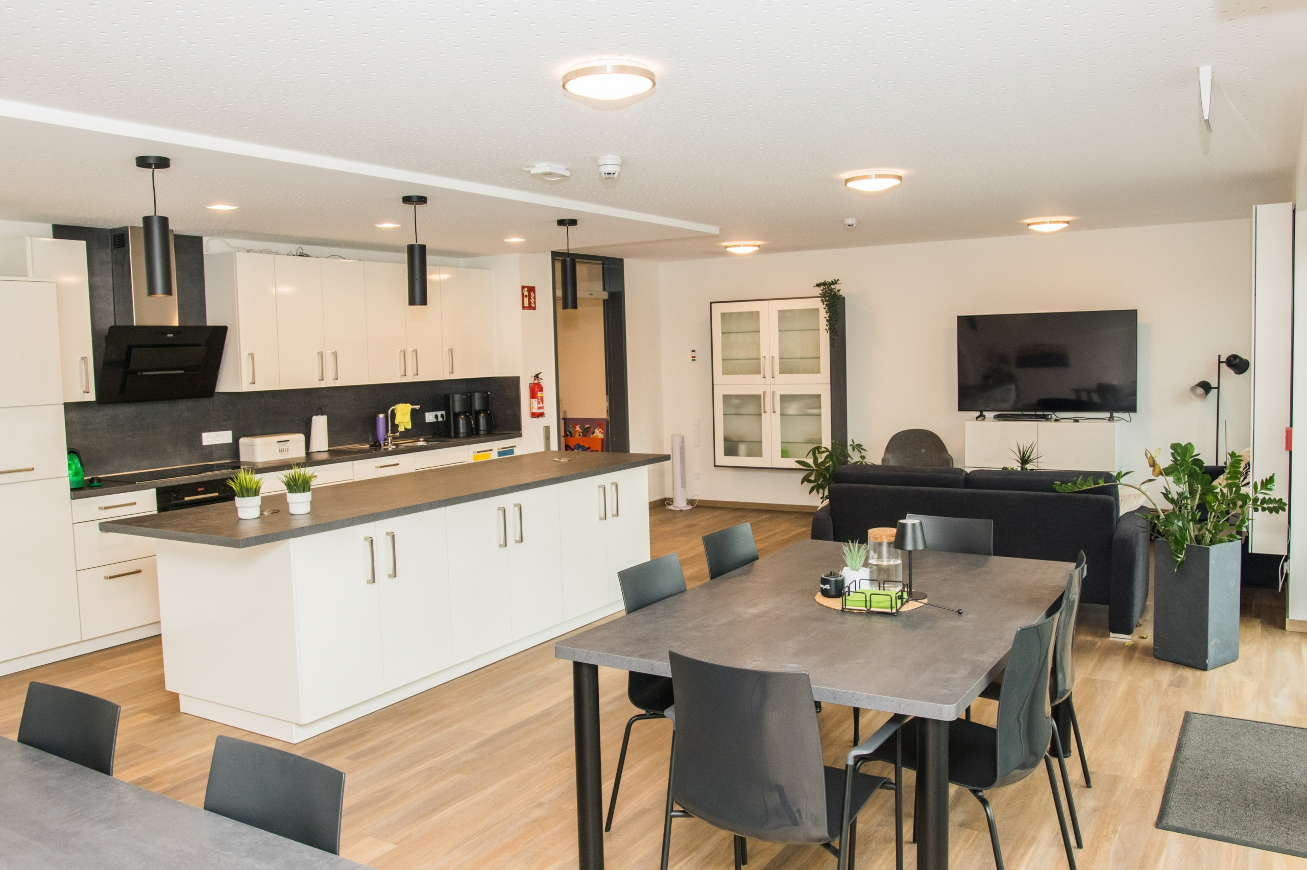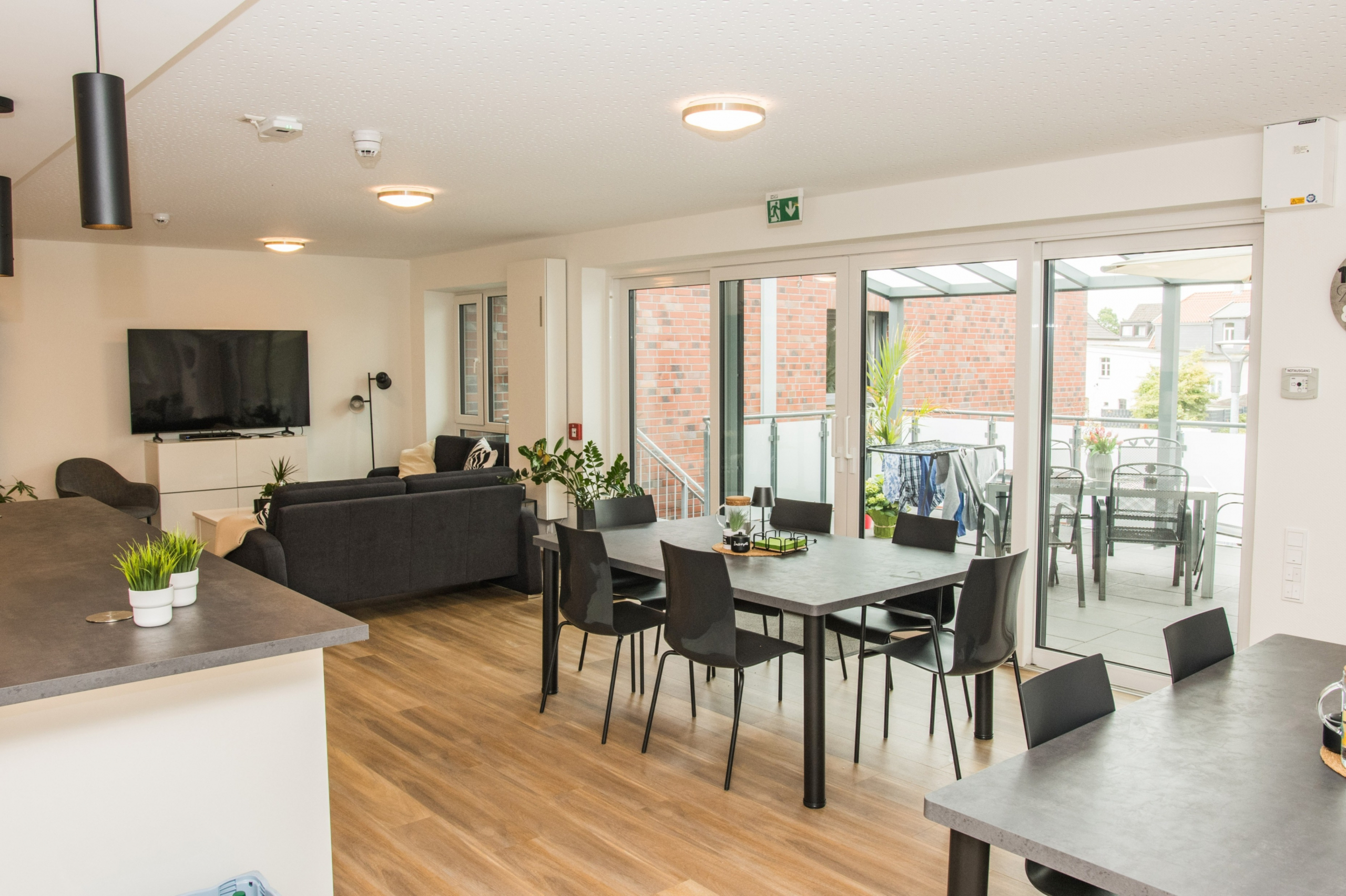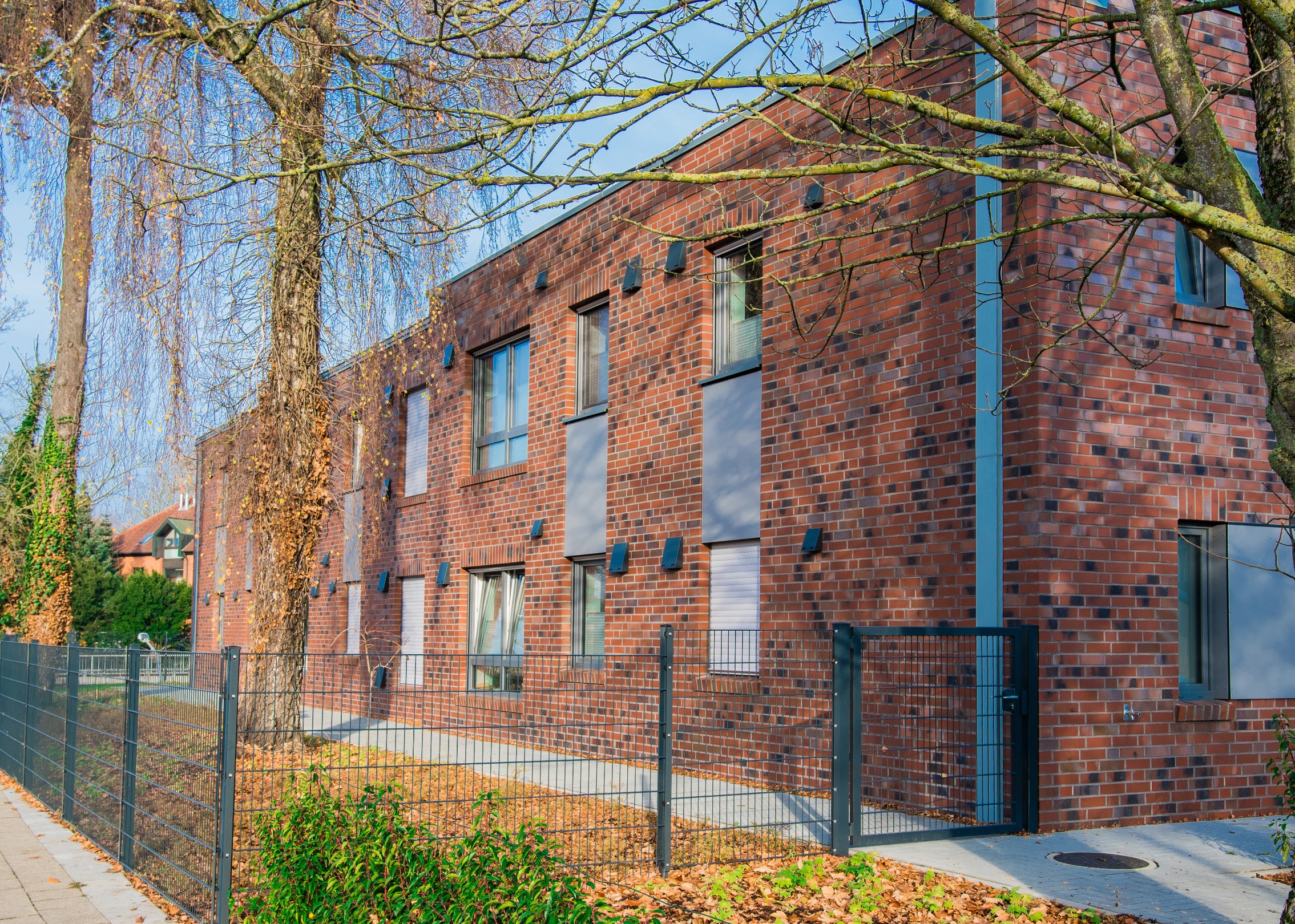 Auf dem Grundstück eines alten Wohnheims entstand eine moderne Wohnanlage, die Menschen mit Einschränkungen ein selbstbestimmtes, würdevolles und gemeinschaftliches Leben ermöglicht. Das neue Gebäude ersetzt die veralteten Einzel- und Doppelzimmer sowie Gemeinschaftsbäder und erfüllt nun höchste Anforderungen an Barrierefreiheit und Teilhabe. Das Konzept umfasst zwei Gebäudewürfel mit jeweils einem hellen Lichthof. Jeder Würfel beherbergt eine Wohngemeinschaft im Erdgeschoss und eine im Obergeschoss. Jede Wohngemeinschaft verfügt über zehn Einzelzimmer mit eigenem barrierefreiem Bad sowie einen großzügigen Wohn- und Essbereich. Hauswirtschaftsraum, Sterilraum, Vorratsraum und ein Büro für Gruppenleitung und Mitarbeitende ergänzen das Angebot. Ein verbindender Baukörper mit Treppenhaus und Aufzug sorgt für barrierefreie Erschließung. Im Erdgeschoss ist ein Bereich für die Nachtwache mit eigenem Bad untergebracht. Hier befinden sich außerdem Lagerflächen, Abstellräume, ein Personalaufenthaltsraum mit WC sowie ein Pflegebad für alle Wohngruppen. Die Anlage ist funktional, wohnlich und flexibel nutzbar. Sie bietet Sicherheit, Orientierung und Gemeinschaft, zugleich Freiraum für selbstbestimmtes Leben. Durch die klare Struktur und flexible Raumgestaltung ist perspektivisch auch eine alternative Nutzung, z. B. als Seniorentagesstätte, möglich.